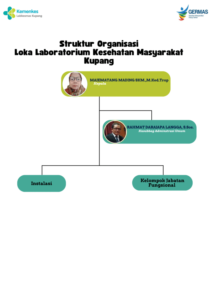Susunan organisasi Loka Labkesmas Kupang berdasarkan Peraturan Menteri Kesehatan No 25 Tahun 2023 tentang Tentang Organisasi dan Tata Kerja Unit Pelaksanaan Teknis Bidang Laboratorium Kesehatan Masyarakat, adalah sebagai berikut