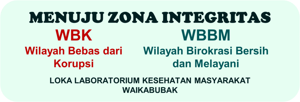 Pelaksanaan Wilayah Bebas dari Korupsi (WBK) dan Wilayah Birokrasi Bersih dan Melayani (WBBM) Laboratorium Kesehatan Masyarakat Waikabubak telah membentuk Tim Kerja Pembangunan Zona Integritas (ZI) menuju Wilayah Bebas dari Korupsi (WBK) dan Wilayah Birokrasi Bersih dan Melayani (WBBM).